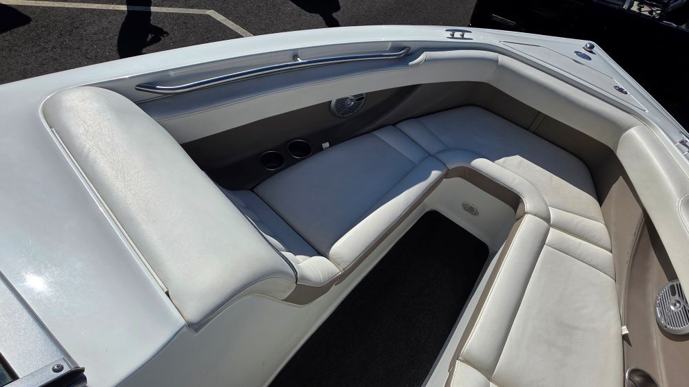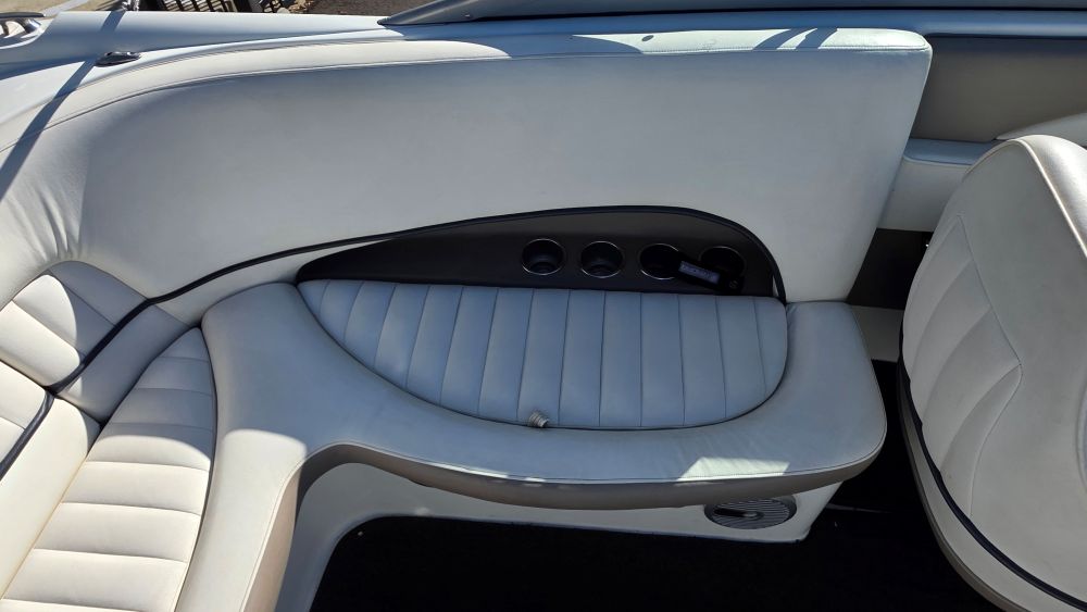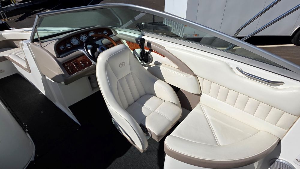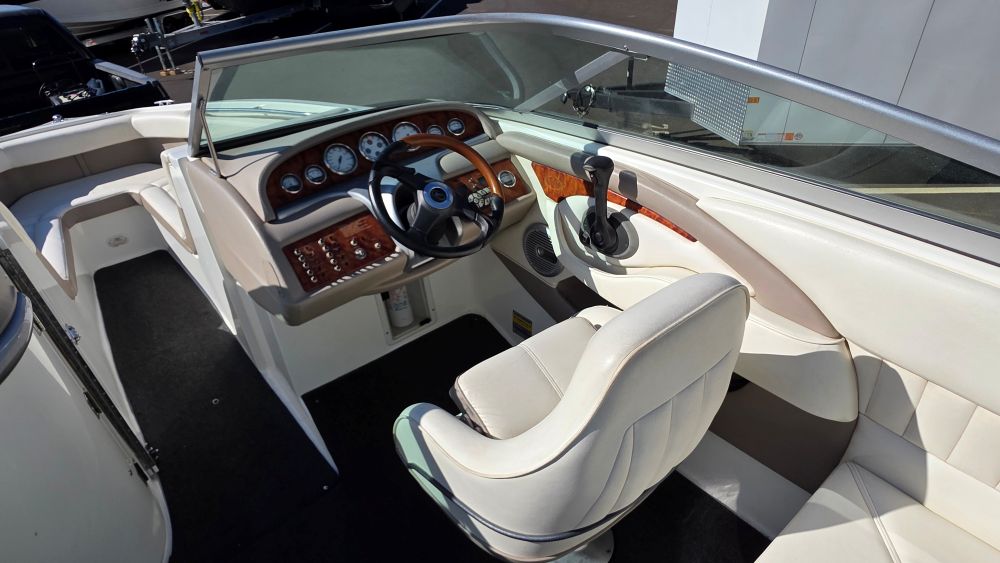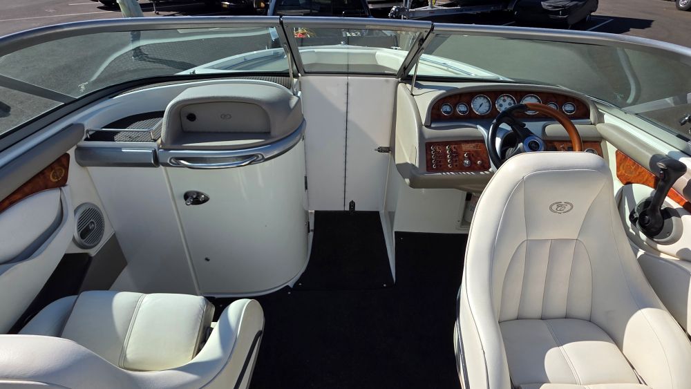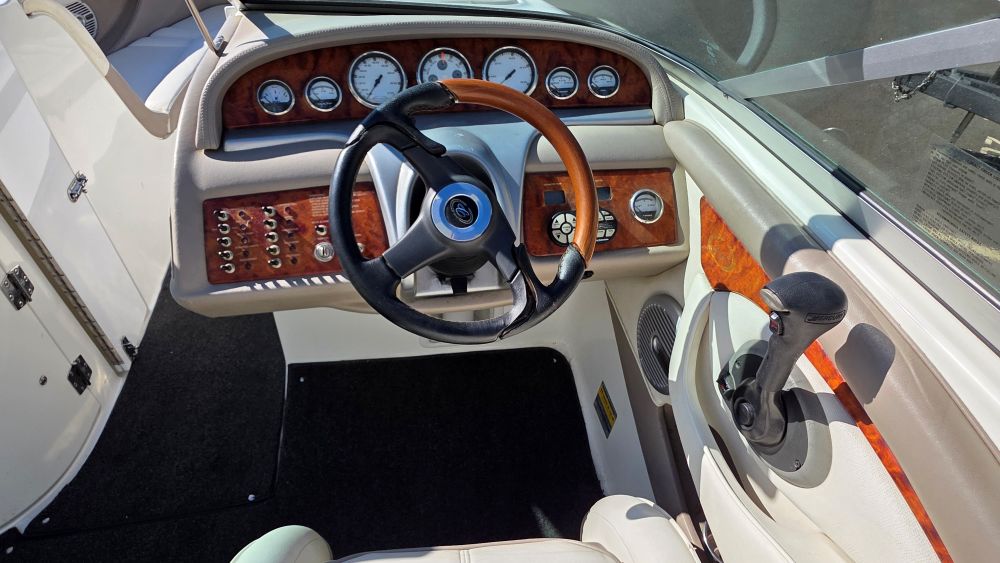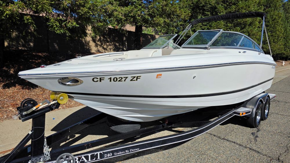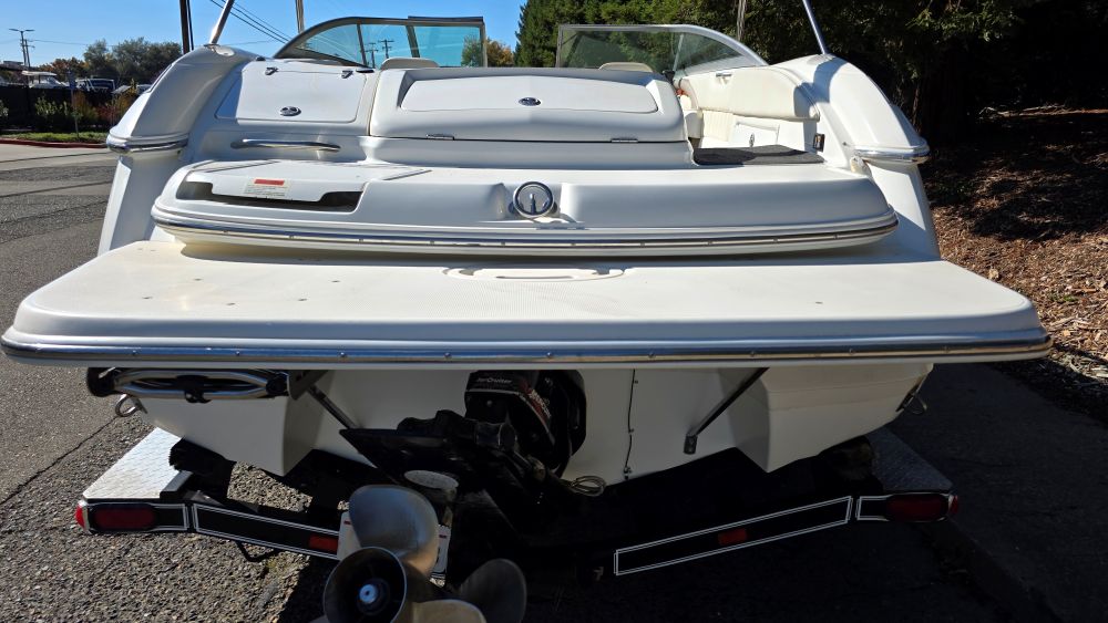 Mercruiser 496 MAG MPI 375hp (serviced May of this year), Mercruiser Bravo III Duo Prop. w/stainless steel props, transom trim switch, dual batteries w/perko switch, bimini top, custom mooring cover w/bimini top cut outs, large stainless steel docking lights, oversized extended swim platform w/boarding ladder, easy access transom storage locker for boards, transom wet storage locker, awesome oversized cockpit dinette table that stores in floor, upgraded sound system w/6 speakers, 262 style woodgrain dash with electronic compass, depth finder , air/water temperature gauge, fiberglass liner w/snap out carpet, enclosed head/storage compartment, bow walk through door, swivel captain’s chairs w/bolsters, custom tandem axle trailer w/brakes & spare tire!