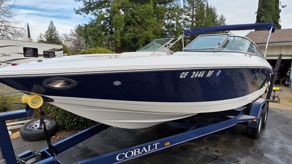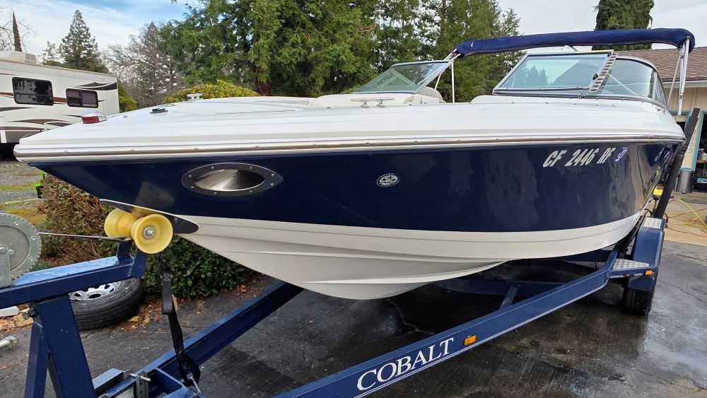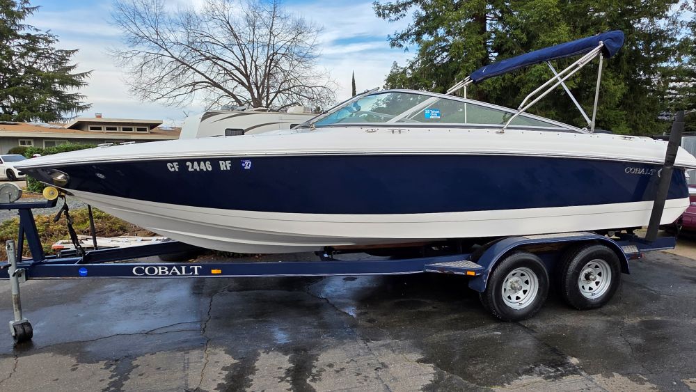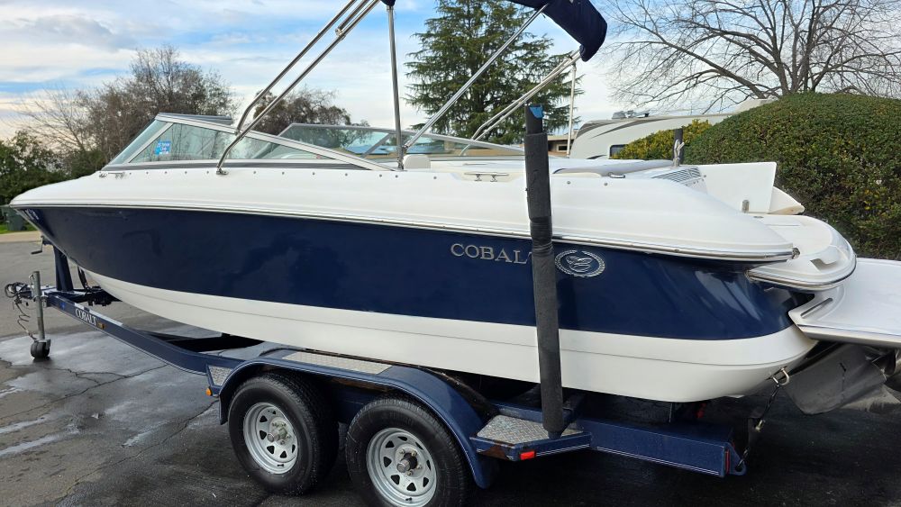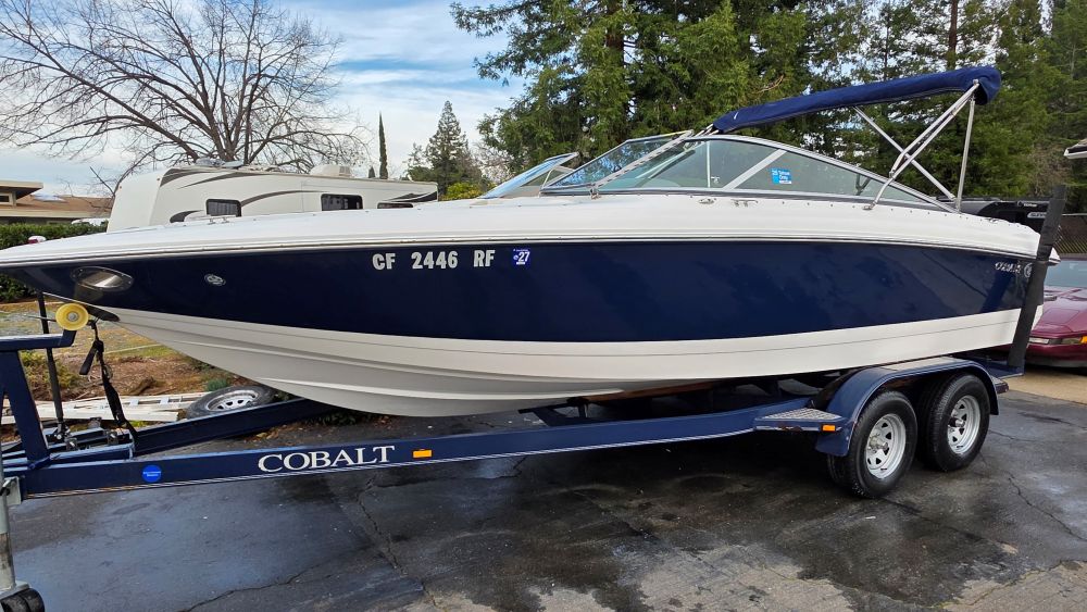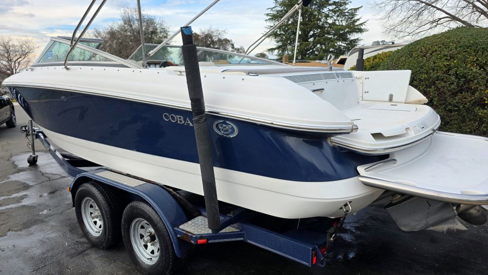 She's a beautiful, rare, Cobalt 226! Featuring classic navy blue graphics she screams elegance, class and begs to be driven. The gelcoat is in excellent condition as is all of the upholstery! The 226 is one of the sleekest and most successful models Cobalt ever built and their fastest hull to this day. Perfect for Lake Tahoe or similar elevations. Boarding is almost automatic with a large factory integrated platform and a deep starboard walk thru transom. Once inside you'll experience the essence of Cobalt with attention to detail second to none and a spacious, functional cockpit with L shape seating and more storage than you'll need. Features & equipment include but are not limited to: a powerful freshwater cooled Volvo 8.1 GI DP 375 HP (496 big block) w/270 original hours, Volvo DP (duo prop) outdrive w/stainless steel props, oversized extended swim platform, transom gate, 6 Speaker upgraded CD sound system w/hard wired driver remote. She sounds very nice! Large stainless steel docking lights, bimini top, bow cover, cockpit cover, full mooring cover, aft walk thru filler cushions, bow walk thru doors, fiberglass liner with plush stone snap out carpet, dual batteries w/3 position switch, electric motor box actuator, depth finder, air temperature gauge, water temperature gauge, custom tandem axle trailer w/brakes, spare tire & side guides!